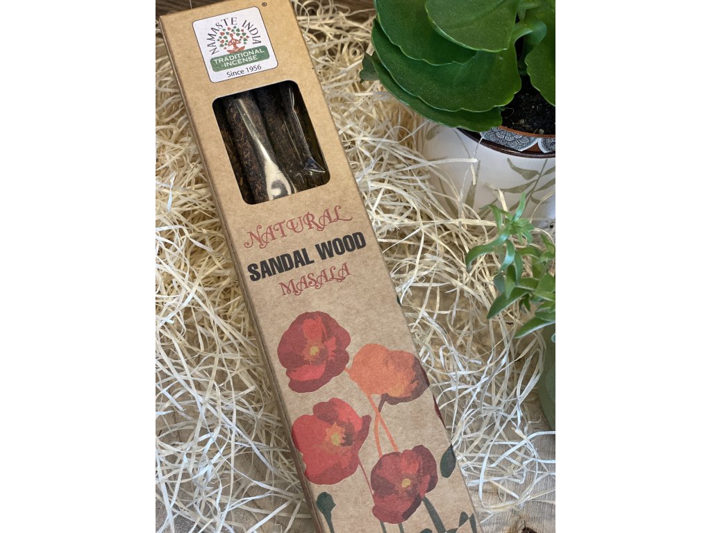 S príjemnou vôňou santalového dreva sa budete cítiť ako vo wellnes. Vonné tyčinky Natural Masala sú vyrábané indickou rodinnou firmou. Tieto vonné tyčinky sú bezpečné, počas ich výroby sa používajú etické a z pohľadu životného prostredia udržateľné praktiky. Na ich výrobe sa nepodieľajú deti. Sú ručne šúľané a hrubšie ako bežné vonné tyčinky, čo prináša extra dlhú dobu tlenia (90 - 120minút)